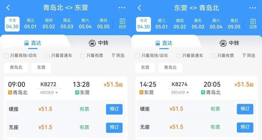 K8274次:东营14:25始发,经停博兴、桓台、潍坊、胶州、蓝村,青岛北20:05终到,全程运行时间5小时40分,票价51.5元。