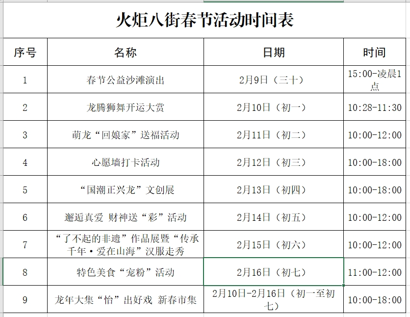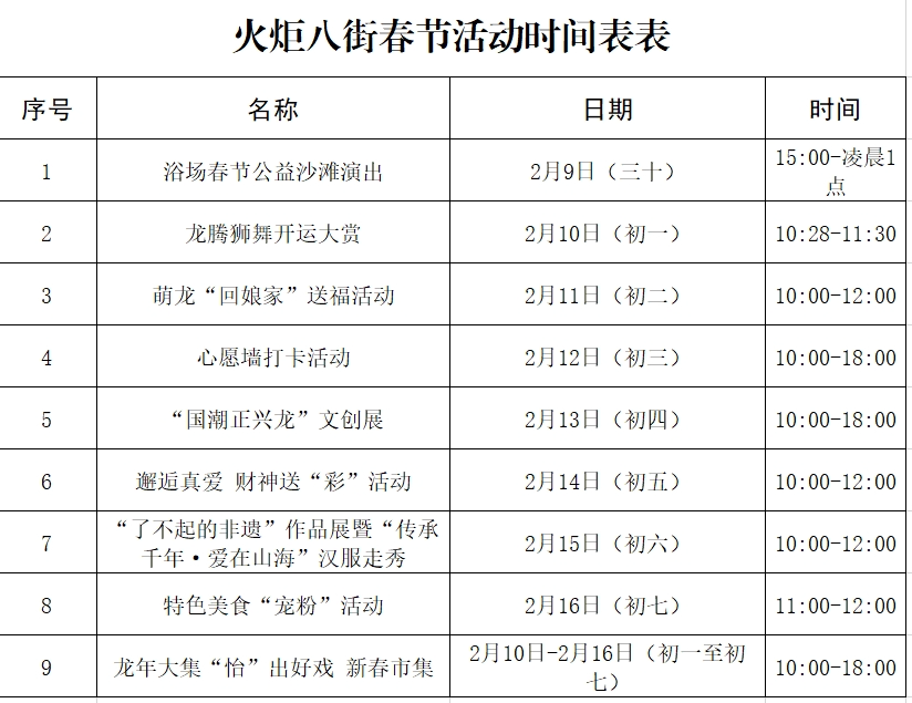 2月10日(大年初一),在火炬八街进行龙舞新春舞龙舞狮民俗表演,邀请游客及市民共同参与到活动中来,祝所有游客及市民万事兴龙,拥有一年的好运。