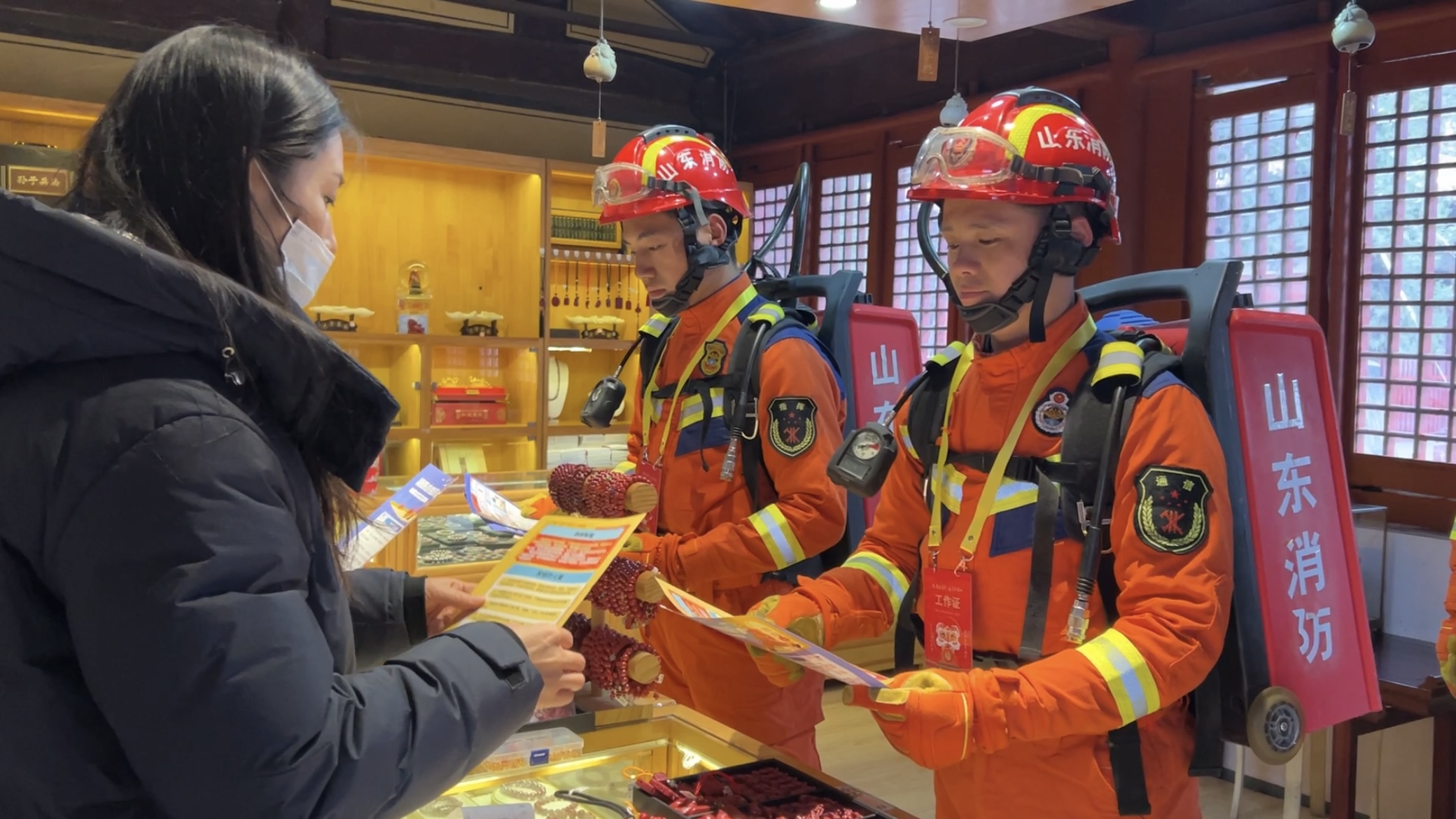 “现在冬季火灾频发,近期咱们用电用火一定要小心。给您发一下消防知识宣传的彩页,日常生活中的消防知识上面都有,比如……”记者跟随消防员走进一家又一家商铺,听着消防员对店员一遍遍认真嘱咐。“消防联勤也是三孔消防救援站的一项日常工作,检查商户灭火器配备、消防通道、应急照明设施等情况,同时宣传消防知识。”三孔消防救援站站长柳猛说。