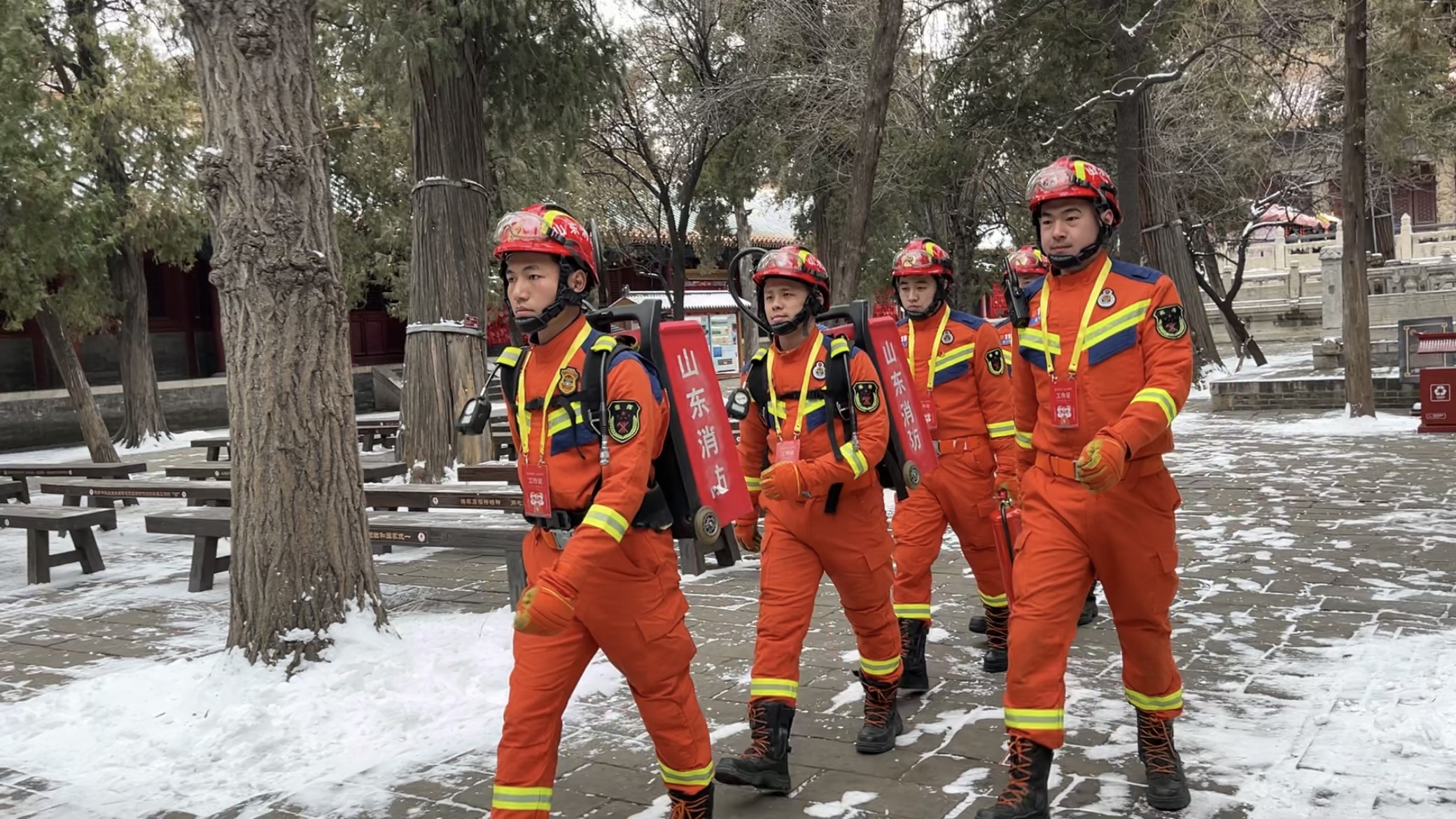 “来啦!”“哎,今天挺冷!”走在孔庙中,不时有摊位工作人员跟消防员打招呼。“作为在景区值守的消防救援队伍,在文物、古建筑林立的景区消防车派不上用场,防火灭火只能徒步行进。我们每天巡查,自然跟各摊位的工作人员成了老相识。”三孔消防救援站班长孔超说,景区消防应急救援站主要的工作就是防火与灭火,前置备勤巡逻做到位,没有发生任何灾情,是大家最满意的事,“没有战功就是最好的战功。”