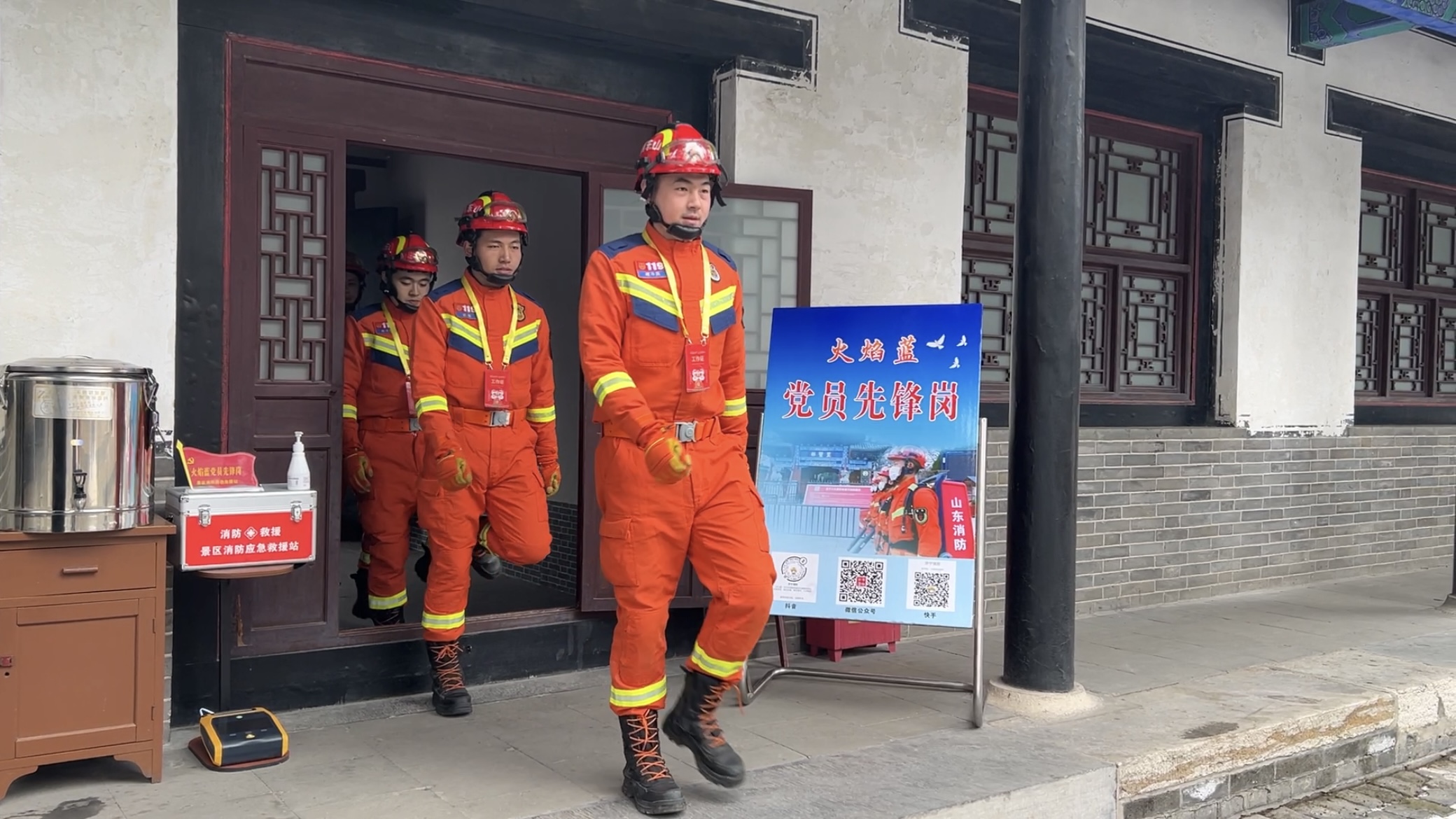 “你好,我家小孩刚刚滑倒手摔破皮了,咱们这有碘伏吗?”“有的,这就拿给你。”在景区消防应急救援站中还设有“火焰蓝”党员先锋岗,岗位主要配有热水桶、急救药箱、除颤仪等设施。孔超介绍道:“在人流量较大的时段,我们还会到主要景点为游客宣传消防知识,解答游客关于消防安全的问题,帮助游客解答关于游览路线的咨询。”