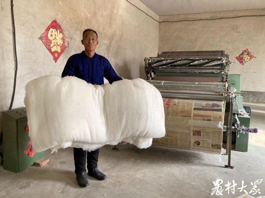 王延河老人展示自己弹好的棉絮。