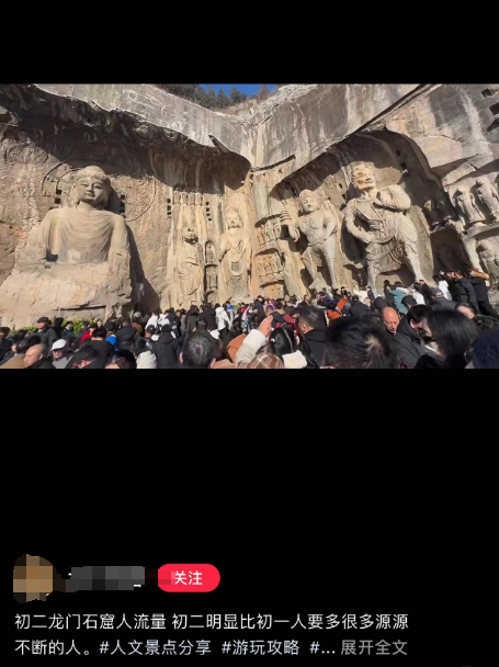 龙门石窟景区公告:龙门石窟景区2月11-14日(初二至初五)线上预约仅剩少量余票,尚未预约游客可选择2月14日(初五)之后日期,错峰出行。已预约游客请按照预约时段入园参观。