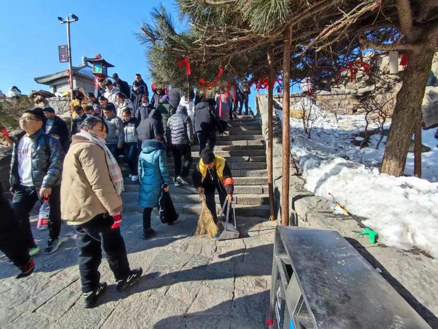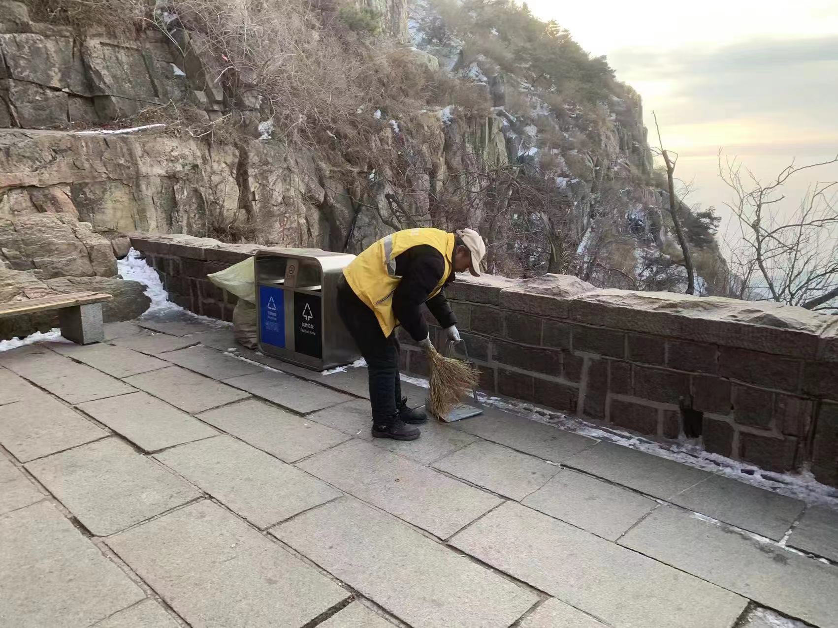 春节期间,当很多人在享受假期时,在泰山上,总能看见一个个橙黄色的身影,他们清扫落叶、捡拾垃圾、擦洗公共设施、冲洗地面……他们用辛勤的劳动为广大市民游客营造干净整洁、文明有序的景区环境。