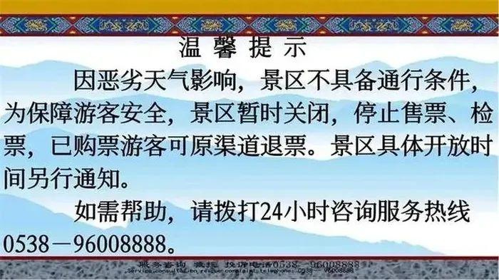 记者从泰山景区管委会了解到,因恶劣天气影响,景区不具备通行条件,为保障游客安全,景区暂时关闭,停止售票、检票,已购票游客可原渠道退票。景区具体开放时间另行通知。游客如需帮助,可拨打泰山景区24小时咨询服务热线0538-96008888。