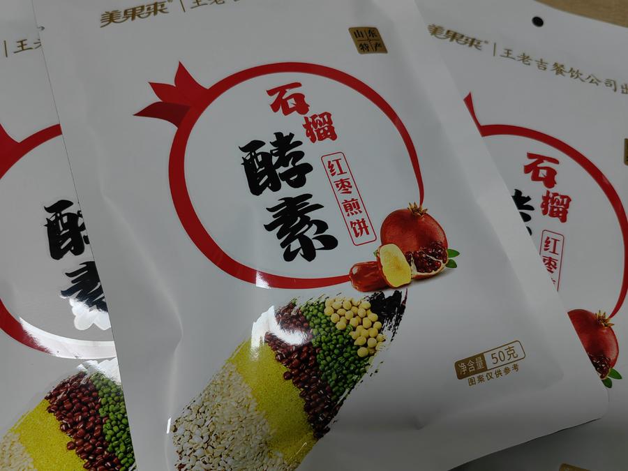 口碑传开,市场就打开了。为进一步提高石榴煎饼营养价值,扩大其生产规模,2023年底,王老吉大健康产业园开始研发石榴酵素煎饼。“石榴原汁初步发酵是酒,二次发酵是醋,三次发酵才是酵素。所以酵素更珍贵,有益微生物含量也更高。”王老吉大健康产业园副总经理李永帅告解释其中奥秘。眼下,石榴酵素煎饼已经在枣庄市内的商超、酒店进行试销售。