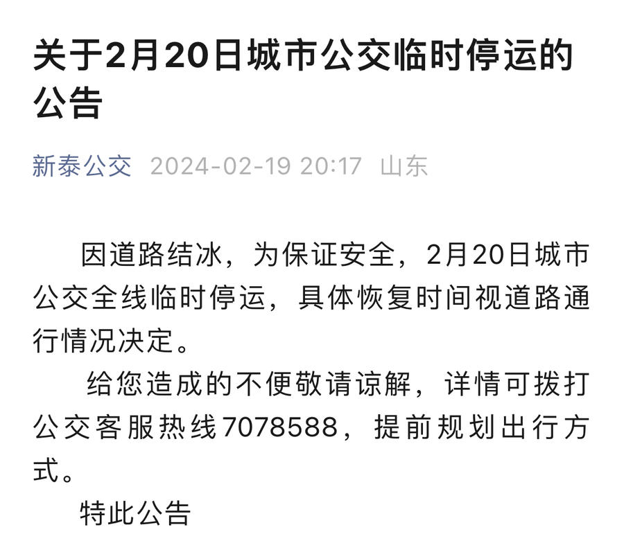 2月19日,新泰公交发布关于2月20日城市公交临时停运的公告