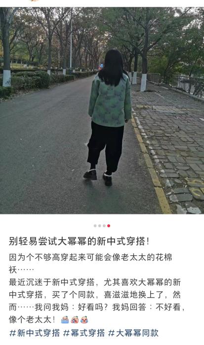 “最近沉迷于新中式穿搭,尤其喜欢大幂幂的新中式穿搭,买了个同款,喜滋滋地换上了,然而……我问我妈:好看吗?我妈回答:不好看,像个老太太!”在社交平台上,有网友如此吐槽新中式棉袄。