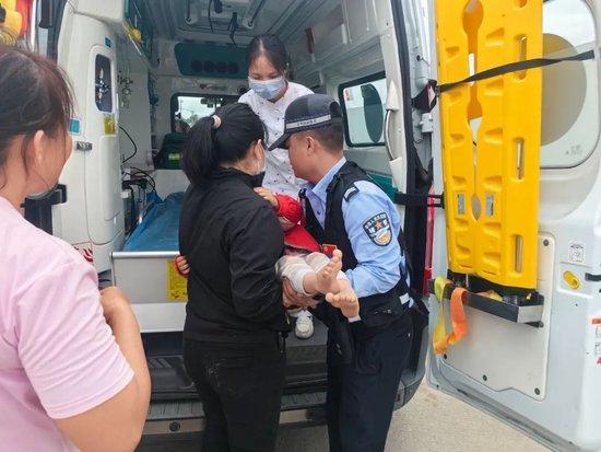民警协助医护人员将受伤孩童送医治疗。