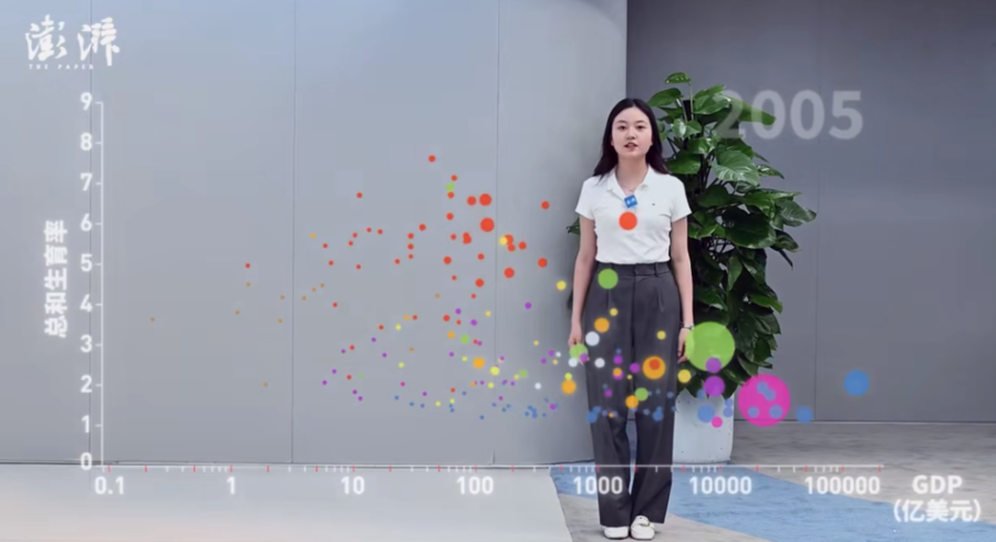 澎湃新闻收集了193个国家与地区近60年与生育相关的6万多条数据,把这些数据利用光标原点的形式放在坐标轴上呈现,设置了“总和生育率”坐标轴、“平均生育率”坐标轴等,通过主持人的讲解和互动,全面呈现了生育率和国家经济之间的关系,生动地将枯燥的人口数据“美术化”,将大量晦涩难懂的数据图示化,将60年间世界各国的生育率变化尽数呈现,对“世界人口的变化”这个大众关注的话题进行了解析。