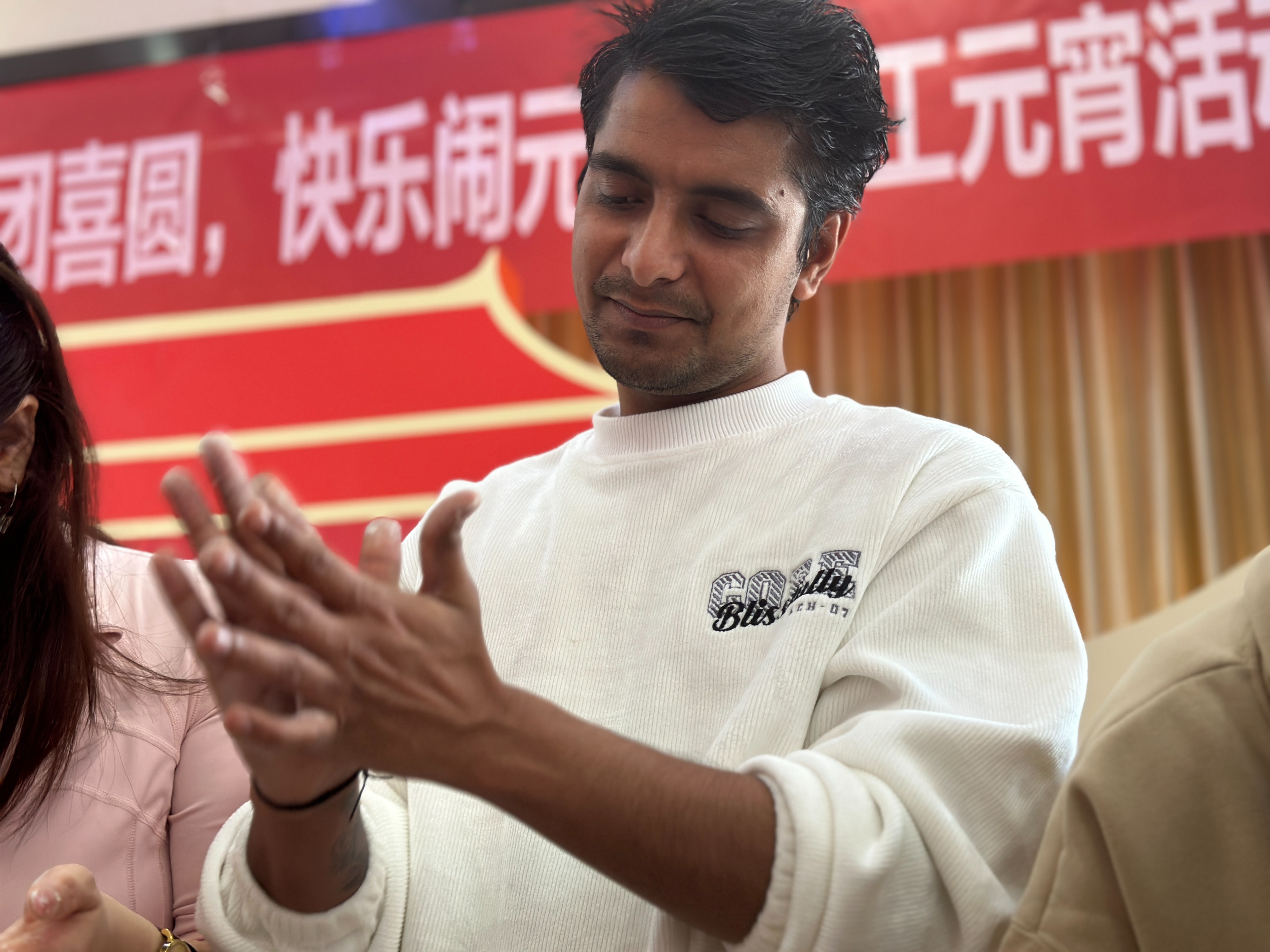 “这是我第一次学包汤圆,让我感觉中国春节和元宵节团圆圆、和和美美的氛围,非常有意思,我感到很开心。”他高兴的说道。在涌金广场上商家初荷瑜伽来自印度的外国友人与商家、居民一起玩猜灯谜,包汤圆、快快乐乐共度元宵佳节。