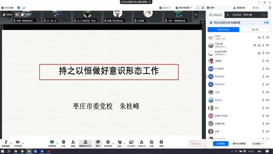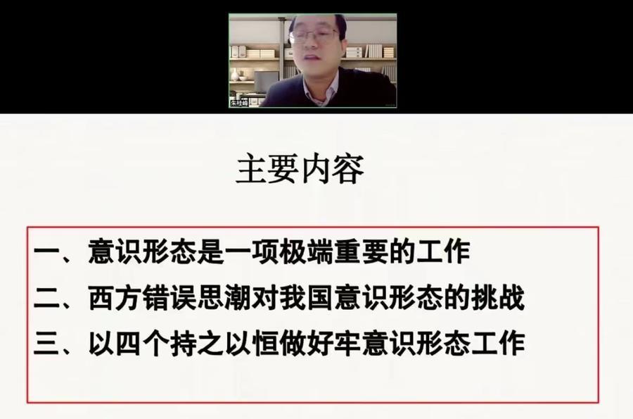 2月22日上午,枣庄职业学院邀请枣庄市委党校副教授、行政学教研室副主任朱桂峰作《持之以恒做好意识形态工作》专题报告。培训采取线上和线下相结合的方式,学院领导郝荣平、梁家和、王念、刘希震、闫博在九楼会议室出席线下培训,全体教职工线上参加培训,学院党委委员、宣传部部长郝艺主持会议。