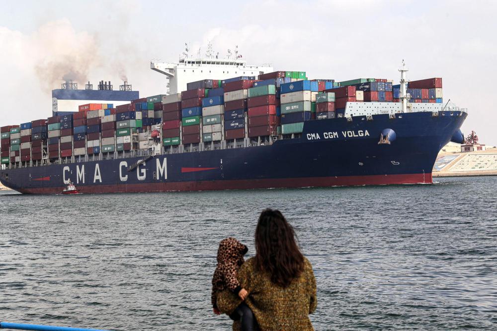 1月13日,在埃及伊斯梅利亚省,一艘货轮行驶在苏伊士运河上。新华社发(艾哈迈德·戈马摄)