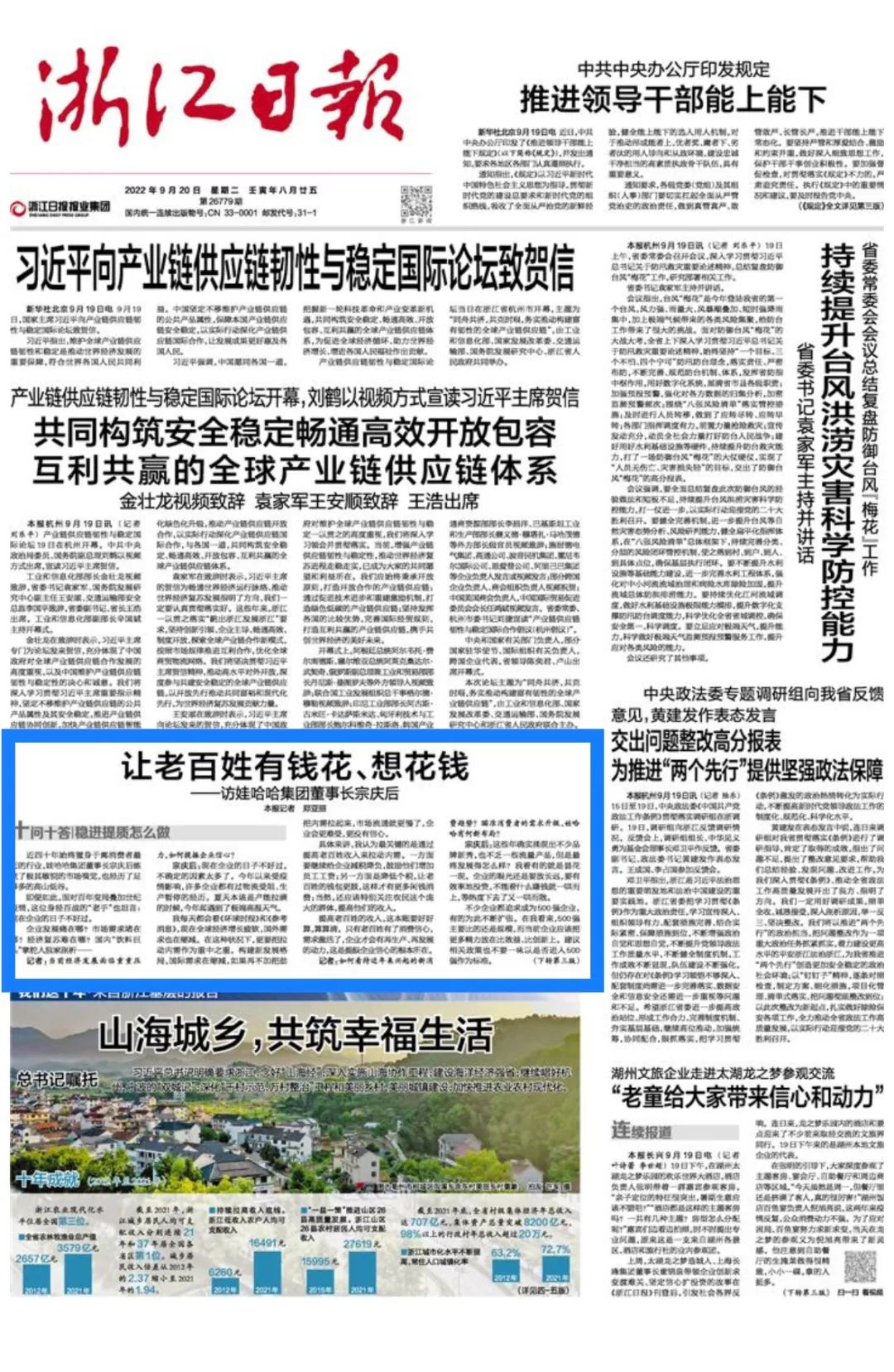 2024年2月25日10时30分,娃哈哈集团创始人、董事长宗庆后,因病医治无效,在杭州逝世,享年79岁。这位42岁白手起家,三次问鼎中国首富的浙商劳模,曾说:“停不下来”。现在,他长长地休息了。此刻,人们正以大量文章和影像,向这位风云浙商致敬。在中国改革开放史上,以宗庆后为代表的浙江企业家,敢为人先、执着专注、深耕主业、追求卓越,造就了创业创新的传奇故事,是支撑高质量发展的宝贵人才。此时的杭州,正经历龙年首场寒潮,低温、阴雨,但记者对宗庆后的记忆,仍停留在那个艳阳高照的夏天。那是2022年8月22日,我们带着《十问十答丨稳进提质怎么做》的专访选题,来到杭州市清泰街160号——娃哈哈集团总部,一座朴素的六层小楼。