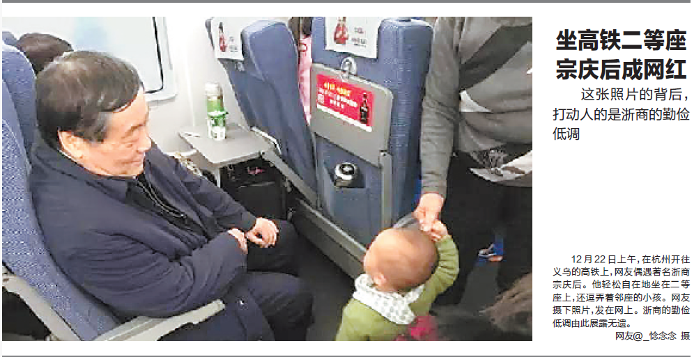 2016年,宗庆后的一张照片登上了各大媒体头条。网友 @_惗念念拍摄了他在高铁上偶遇的宗庆后,彼时他轻松自在地坐在二等座上,还逗弄着邻座的小孩。