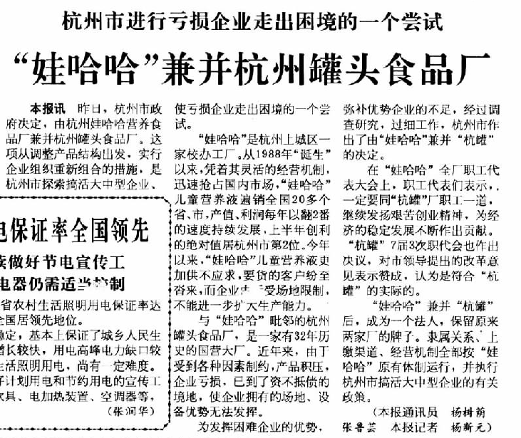 1991年,创业三年多,宗庆后气势如虹,带领杭州娃哈哈营养食品厂成功兼并了2200多人、欠债6000多万元的国有老牌企业杭州罐头厂,28天飞速拉起新生产线,产出新品果奶,“小鱼吃大鱼”,一时轰动全国。