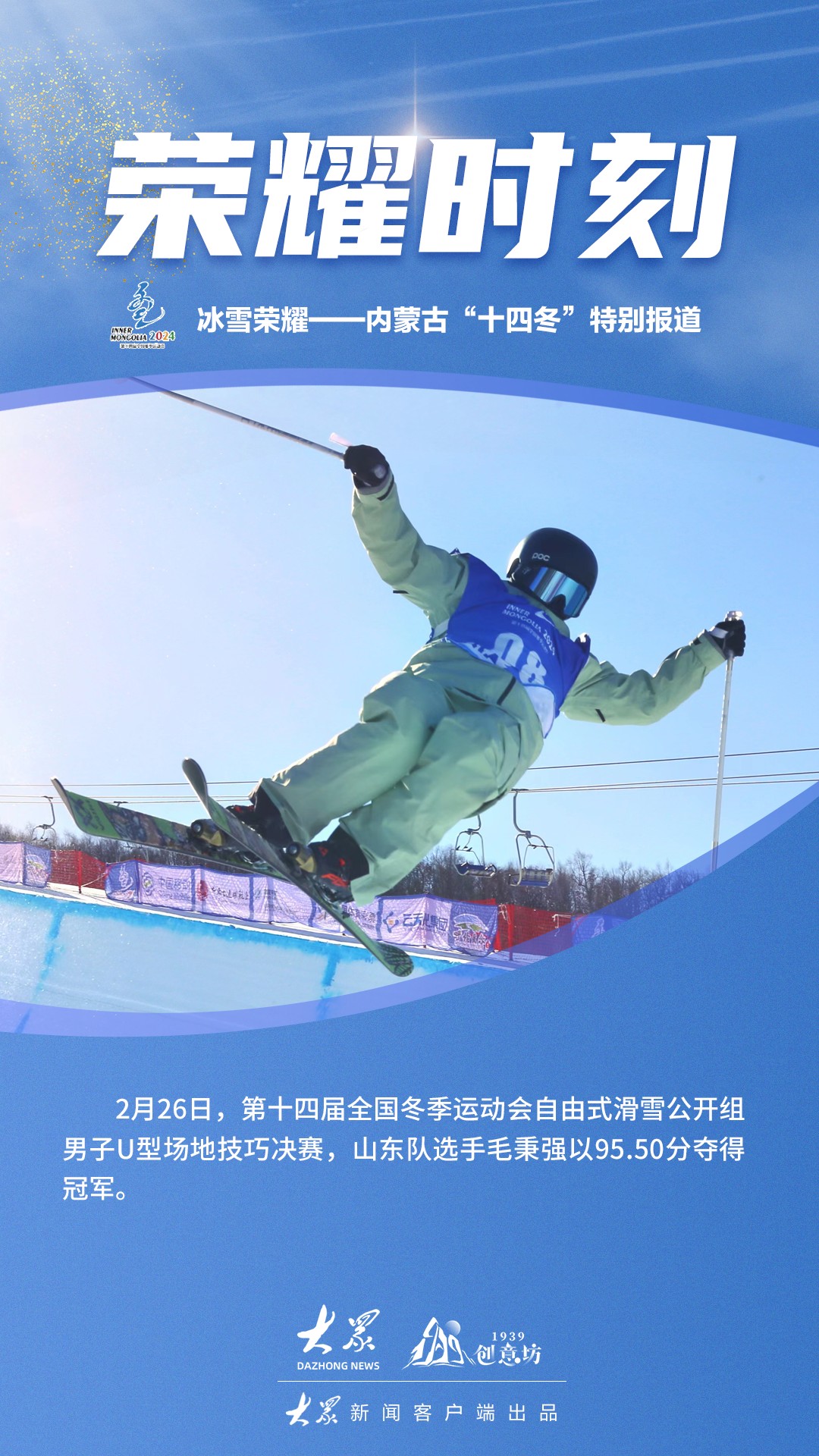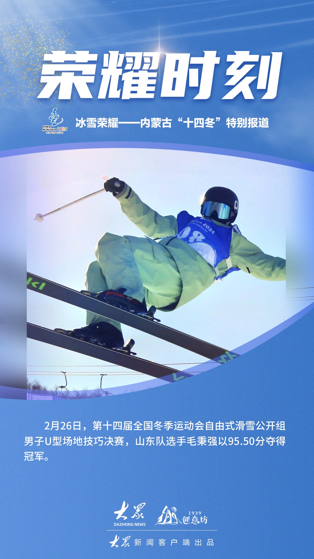 2月26日,第十四届全国冬季运动会自由式滑雪公开组男子U型场地技巧决赛,山东队选手毛秉强以95.50分夺得冠军。