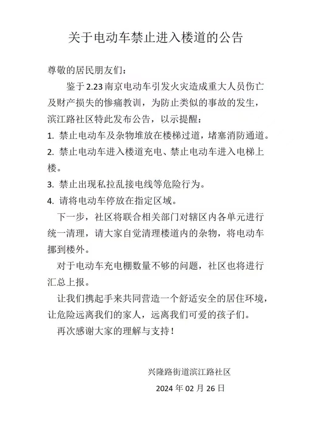“禁止电动车进入楼道充电、禁止电动车进入电梯上楼;禁止出现私拉乱接电线等危险行为……”2月26日,兴隆路街道滨江路社区发布的一则《关于电动车禁止进入楼道的公告》,引发居民热议。据了解,2月23日,南京市电动自行车引发致15人死亡、44人受伤火灾发生后,整治电动自行车安全隐患也在全国范围内引发重视。青岛众多社区、小区也纷纷发布提醒信息,旨在提醒居民不要乱停车。
