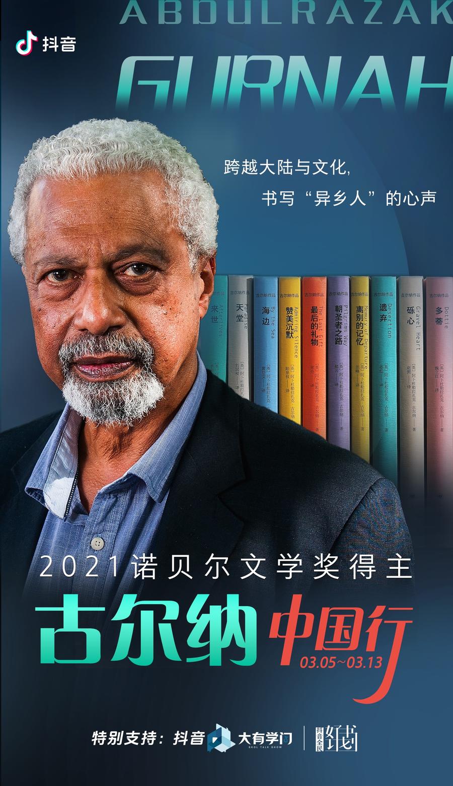 据上海译文出版社消息,2021年诺贝尔文学奖得主阿卜杜勒拉扎克•古尔纳将在今年3月初首次访问中国,在上海、宁波与北京三地展开多场文学与文化交流活动。