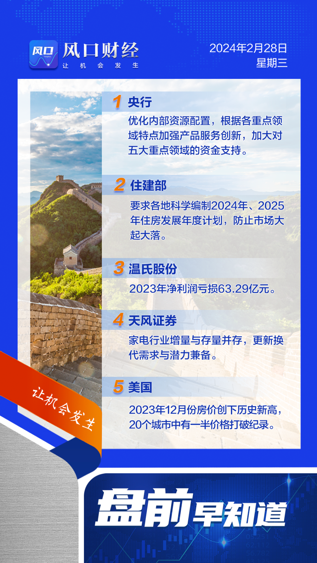 A股盘前:央行将加大对五大重点领域资金支持;住建部要求各地科学编制今明两年住房发展年度计划