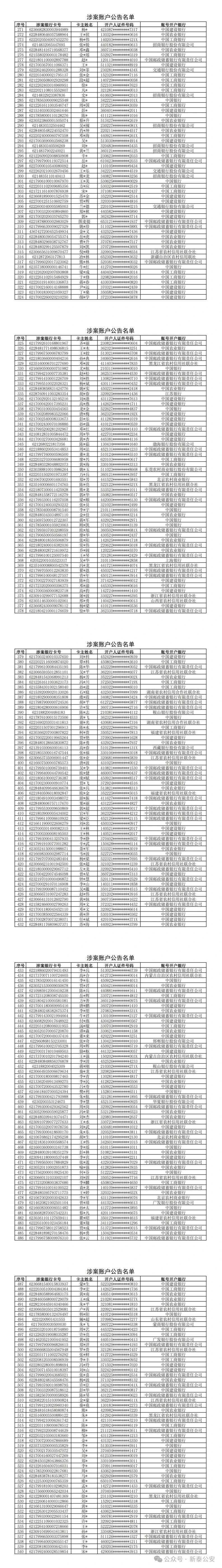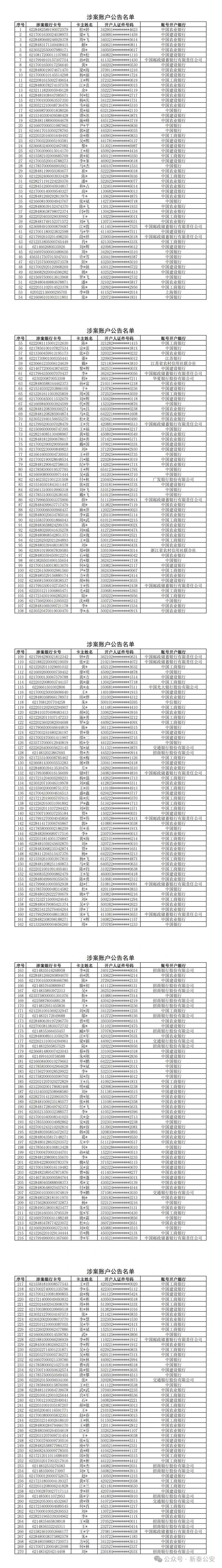 我局在办理“8.10非法利用信息网络”案过程中,对一批涉嫌用于接收、流转赌资银行账户资金依法进行冻结。为维护社会治安秩序,依法打击违法犯罪行为,查清犯罪事实,告知以下银行账户所有人(详见附件)到我局配合调查。根据《中华人民共和国刑法》《中华人民共和国刑事诉讼法》《最高人民法院、最高人民检察院、公安部关于办理网络赌博犯罪案件适用法律若干问题的意见》以及《公安机关办理刑事案件程序规定》等规定,现予以通告:一、冻结银行卡(账户)所有人 (名单详见附件) 请在通告期限内,携带本人有效身份证件、被冻结银行卡开户资料、交易明细以及能够证明银行账户内资金合法来源的相关证明材料,到我局指定联系地址配合调查。二、自本公告发布后,逾期不提供或者不能证明银行卡(账户)内资金合法来源、性质的,我局将依照相关法律规定,对被冻结的银行卡(账户)依法处置。三、对弄虚作假,提供虚假证明材料的,将依法追究法律责任。四、本人涉嫌违法犯罪的、帮助他人犯罪的、有帮助他人逃避法律责任等情形的,将予以追究相关人员法律责任。通告期:2024年2月29日至2024年3月29日。联系人:贾警官、杜警官联系电话:18554203107 15615785531联系地址:新泰市公安局(山东省泰安市新泰市青龙路1209号)本通告至发布之日起施行。