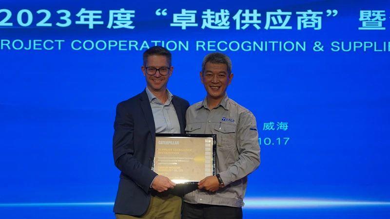 ▲卡特彼勒副总裁为天润工业颁发卓越供应商证书。天润工业提供