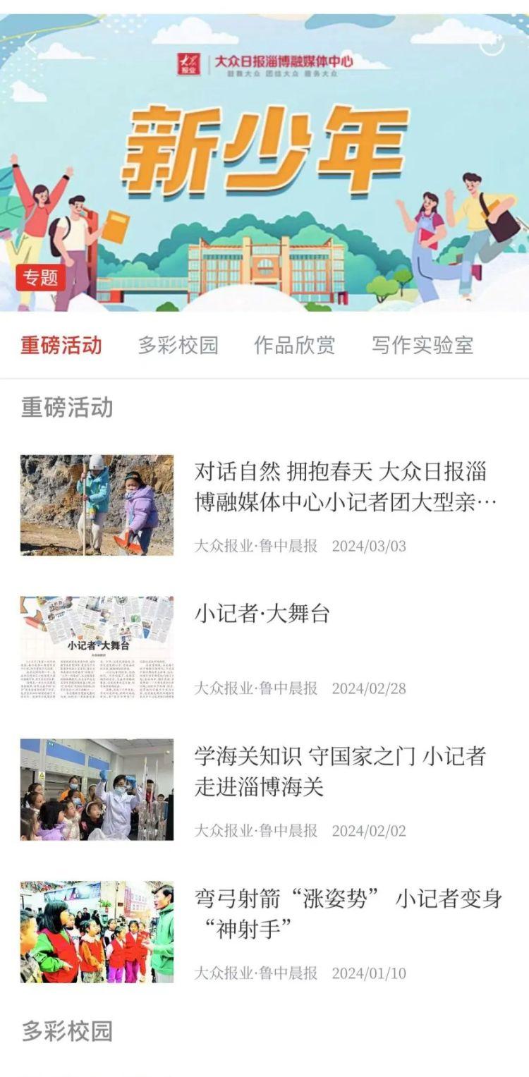 大众日报淄博融媒体中心小记者活动全新升级为《新少年》周刊,联合淄博各中小学校,利用大众日报融媒体平台强大内容生产力,为广大青少年提供社会实践、研学等服务及助学、助考、校园文化活动等热门教育资讯,打造青少年综合素质展示平台。通过优选赛事、趣味活动、实践打卡,为青少年提供交流学习的机会;通过各类征文、习作选登,为青少年提供在大众新媒体大平台、鲁中晨报报纸及新媒体平台发表文章、展现自我的机会;通过“多彩校园”等丰富的栏目,为学生、家长及学校提供最新的教育话题、最有趣的校园新闻……
