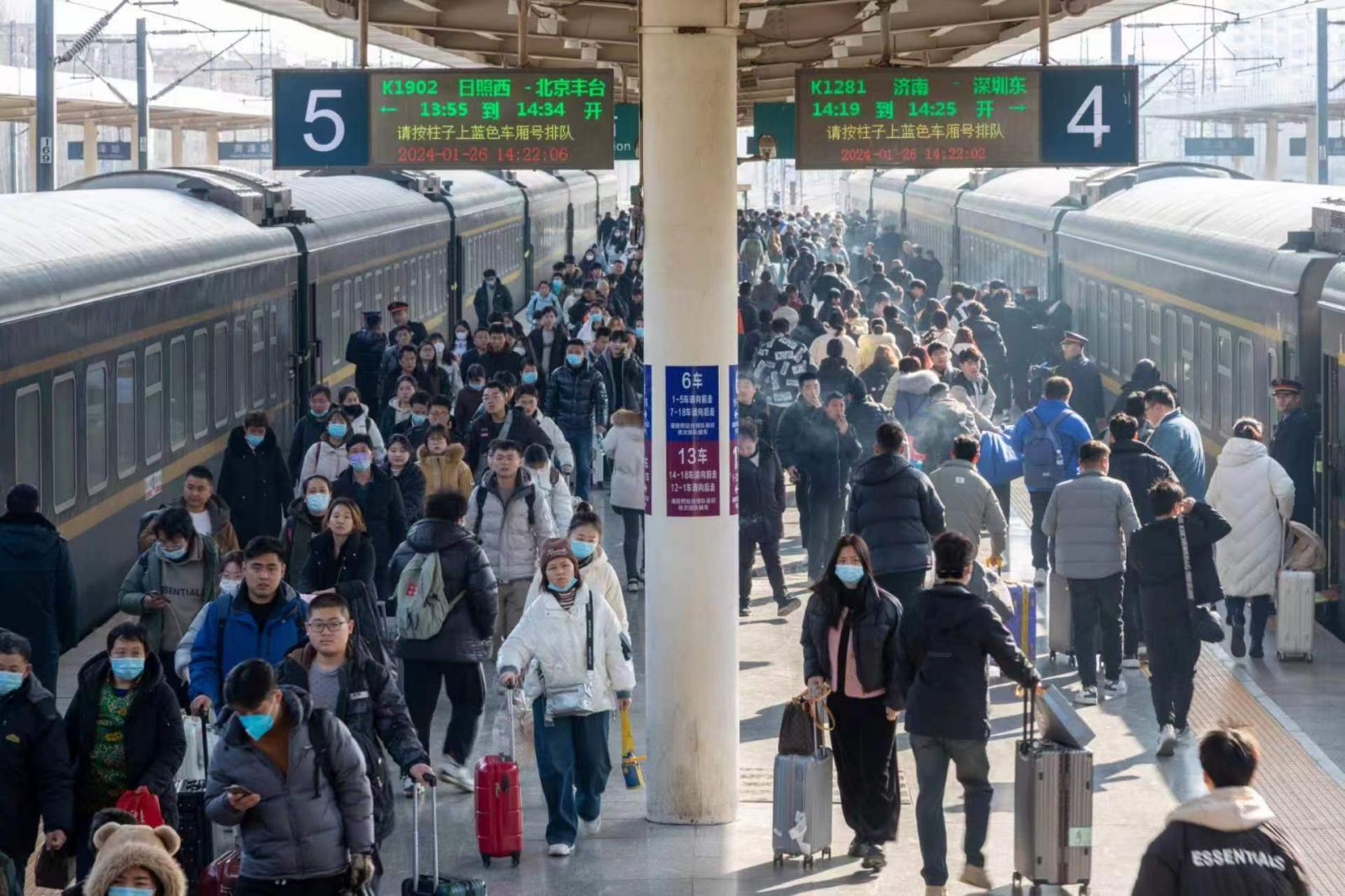 铁路部门发挥高铁成网优势,充分用好济郑高铁、莱荣高铁等新线资源,统筹高铁和普速运力安排,针对春运客流特点,加大运力投放,共加开担当临时旅客列车50.5对。针对探亲、务工客流出行需求,保持普速列车开行规模,加开哈尔滨、福州、金华方向普速临客列车和枣庄、菏泽、聊城等省内普速临客列车,共计加开担当普速临客列车14.5对。针对春节假期时间长,旅游、探亲流相对增多,于正月初二启动临时旅客列车开行方案,部分临客安排假日期间每日开行。针对春运客流需求旺盛的热门方向、区间和时段,共计安排重联动车组43.5对,加挂车辆16.5对48辆,最大限度满足旅客出行需求。