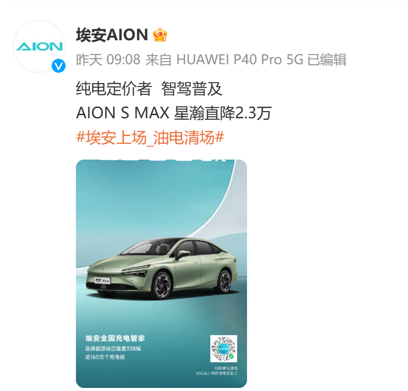 而在两天后(3月5日),广汽埃安又宣布,AION S MAX星瀚版降价2.3万元。据了解,星瀚版为顶配车型,官方售价为17.99万元,降价后售价15.69万元。这一价格仅比入门版车型贵7000元。