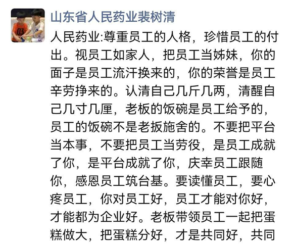 裴树清的朋友圈时常表达对员工的尊重和关爱