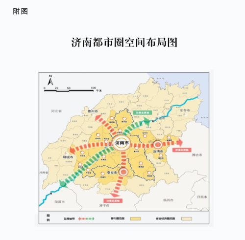 今天的济南都市圈范围是“内陆型”的,都市圈主要沿济淄发展轴、济泰发展轴和沿黄发展轴“三轴”发展,即沿着胶济线、京沪高铁、黄河发育。