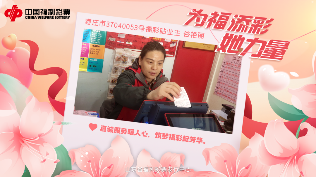 枣庄市37040053号福彩站业主谷艳丽干一行爱一行,将满满的爱倾注到了站点和彩友身上。24年的工作历练,让谷艳丽从一名下岗工人成长为一名优秀的福彩销售员。谷艳丽坚信,辉煌的成绩终究属于昨天,明天的她势必以更加饱满的热情,更加灿烂的笑容,去迎接每一位新老彩友的到来。相信在未来的日子里,她也一定能在自己的岗位上继续发光发热,为公益事业贡献自己的力量。