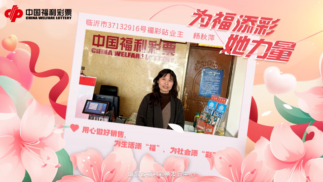 “只要用心,没有办不好的事情,做不出的成绩。”这是临沂市临沭县37132916号福彩站业主杨秋萍一直秉持的经营理念。她不断地努力经营充实自己,用心做好销售工作,近几年销量一直保持全县第一。2023年她的站点通过星级评定,获评“五星级销售场所”。她说:“我从事过很多工作,福彩销售员是我最正确的一次选择,以后会继续做好这份工作,充分发挥自己的光和热,为公益和福利事业贡献更多力量,为更多的朋友带去幸运,为福彩事业添福添彩。”