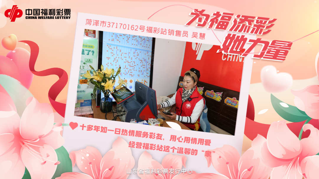 花乡菏泽有一群了不起的“她”,为菏泽福彩事业默默奉献着自己的青春,37170162福彩站销售员吴慧就是其中的一位。吴慧20多岁加入福彩队伍从事销售工作以来,十多年如一日热情周到地服务彩友,钻研业务知识诚信经营,用心用情用爱经营福彩站这个温馨的“家”,在平凡的岗位上诠释着敬业担当。