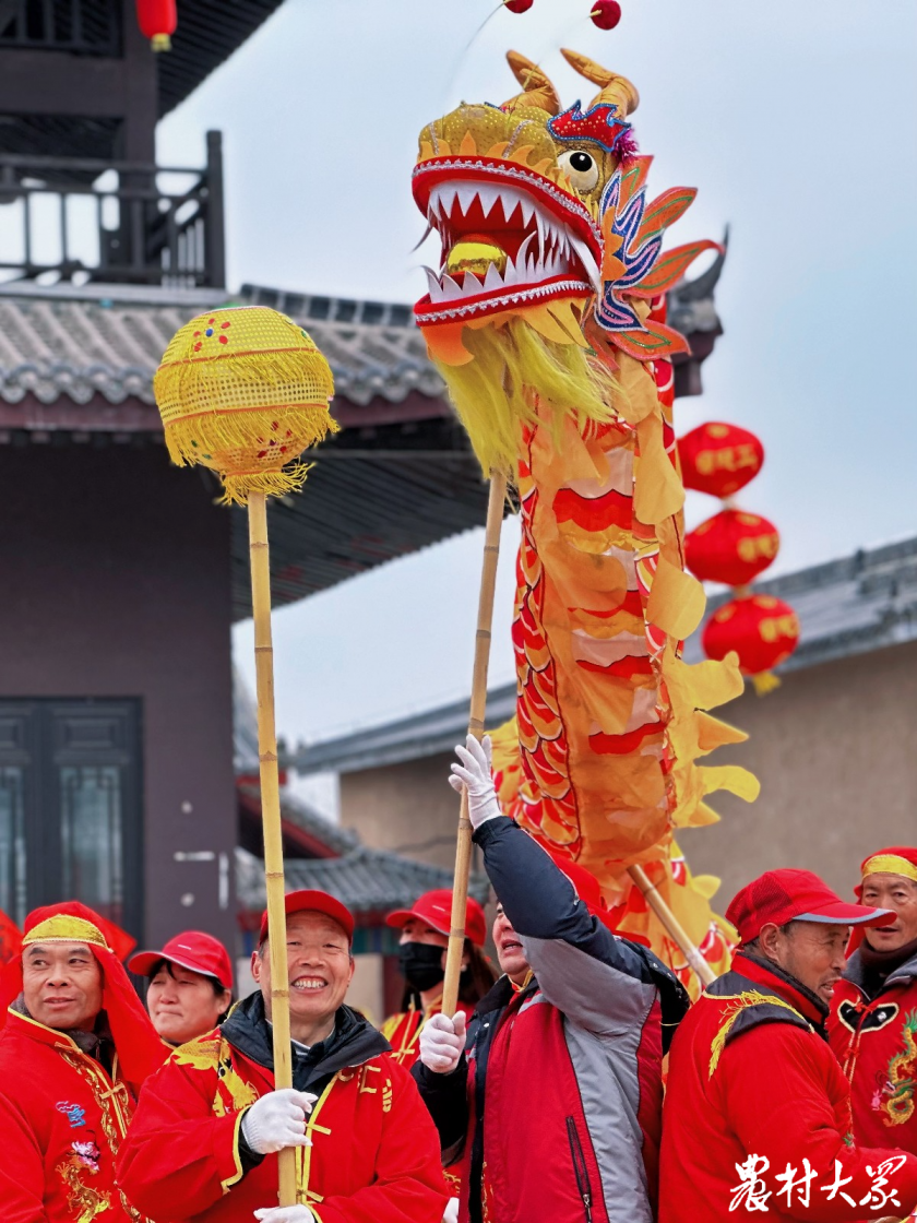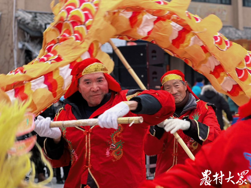 身着红褂、头戴红帽的演员们舞动长龙,在龙珠的引导下,时缓时急。