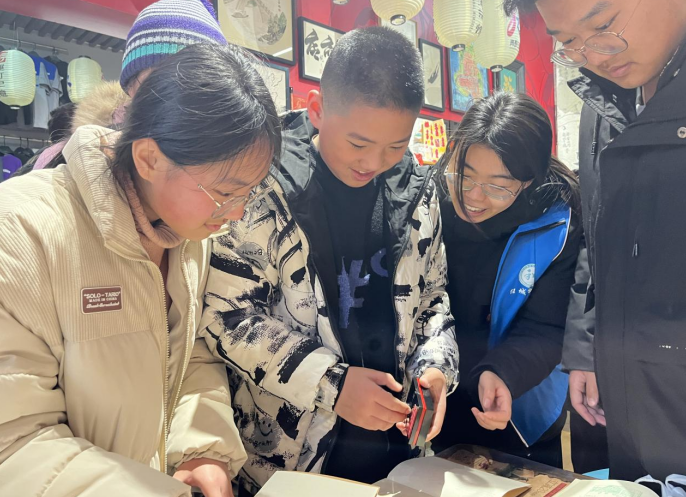 活动中,社区工作人员首先通过播放纪录片,让学生们了解大运河的历史,开凿背景、开凿时间,以及作为运河之都济宁抒写的历史传奇。随后社区网格员为学生们分发笔记本,带领他们来到运河记忆“青年商店”打卡处进行打卡盖章。