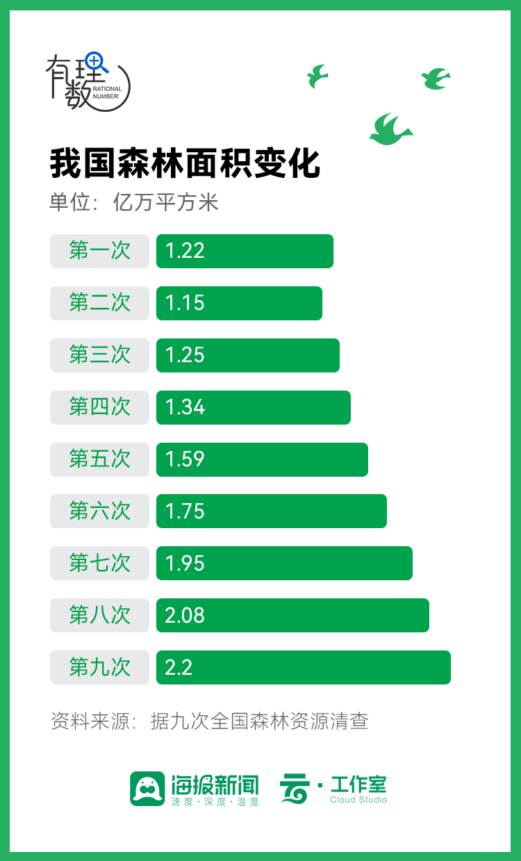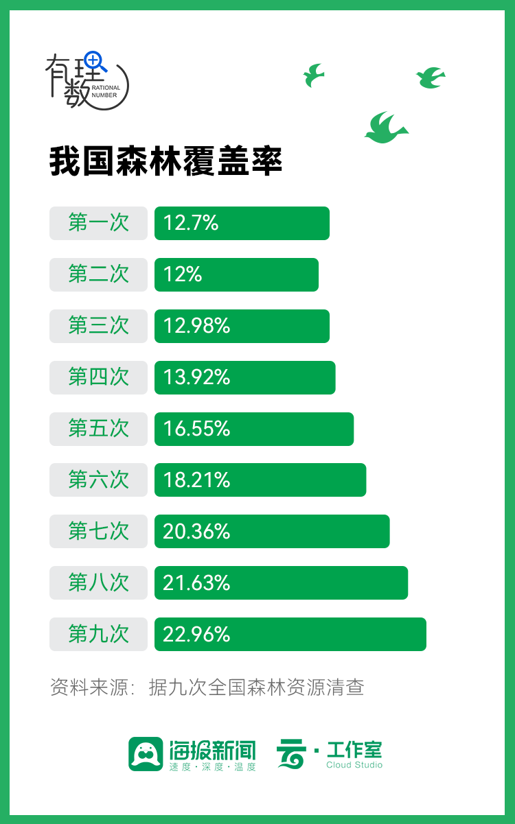 回望九次全国森林资源清查结果可以看出,我国的森林覆盖率逐年稳步提高: