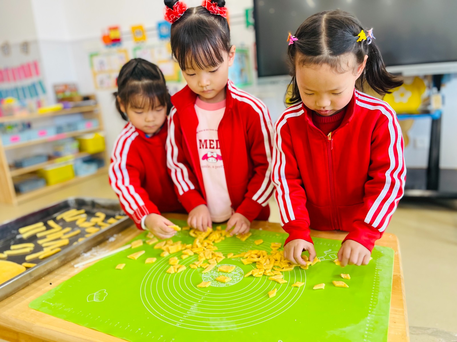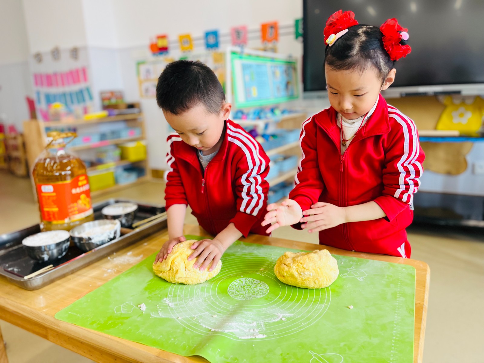 农历“二月二”,有吃面旗子的传统习俗。看,中大班组的幼儿,亲手和面、擀面皮、切面片、炒豆子、裹糖霜忙得不亦乐乎……幼儿通过亲身体验,体验制作传统小吃的乐趣。