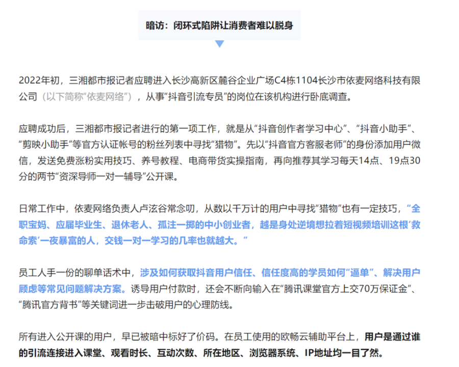 2022年“3·15”期间,三湘都市报记者前往长沙高新区某科技公司,以“抖音引流专员”的身份进行卧底调查。近半个月的卧底中,记者发现,该公司是假借抖音官方导师之名卖课的操盘者,利用普通人的造富心理诱导退休老人、宝妈、下岗职工交钱报名,落入“一夜暴富”的圈套,课程中提到的“轻松月入数十万”的造富故事并无真实依据。报道《交2980元,你就能成下一个“罗永浩”?》发布后,中国新闻网、人民日报客户端、湖南省消保委微信公众号等中央媒体及省内政务新媒体纷纷转载,位列多家第三方平台的热榜前十位。