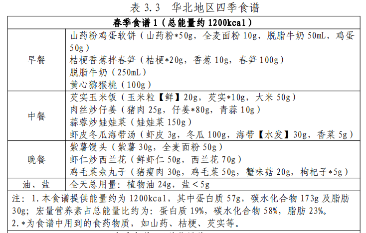 山东属于华北地区,多数地方喜面食及畜禽肉,蔬菜和水产类摄入不多,厚重咸口菜品居多。《指南》中,国家卫健委特别定制了华北地区四季食谱。