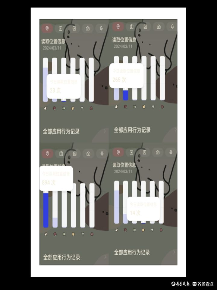 记者通过数据监测发现,一天之内,某短视频APP读取位置信息894次,小红书读取位置信息265次,微信读取位置信息23次。