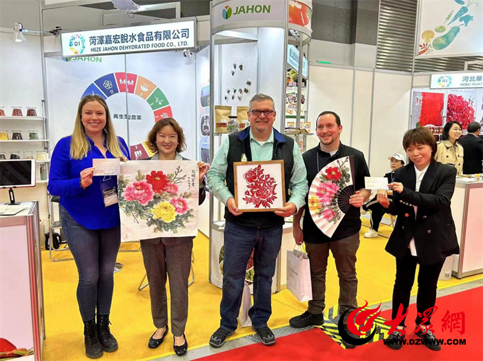展会现场,嘉宏公司的展台上不仅摆放了公司的系列参展产品,还在醒目位置摆放了来自定陶的书画、剪纸以及手绘折扇等带有不少牡丹元素的非遗作品,让菏泽牡丹绽放在了国际展台。