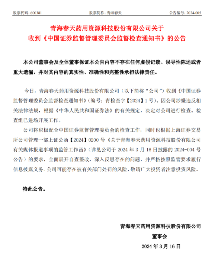 3月16日,青海春天药用资源科技股份有限公司(简称“青海春天”)发布公告称,公司收到《中国证券监督管理委员会监督检查通知书》(编号:青检查字【2024】1 号)。因公司涉嫌违反相关法律法规,根据《中华人民共和国证券法》的有关规定,决定对公司进行检查。检查组已进场开展工作。