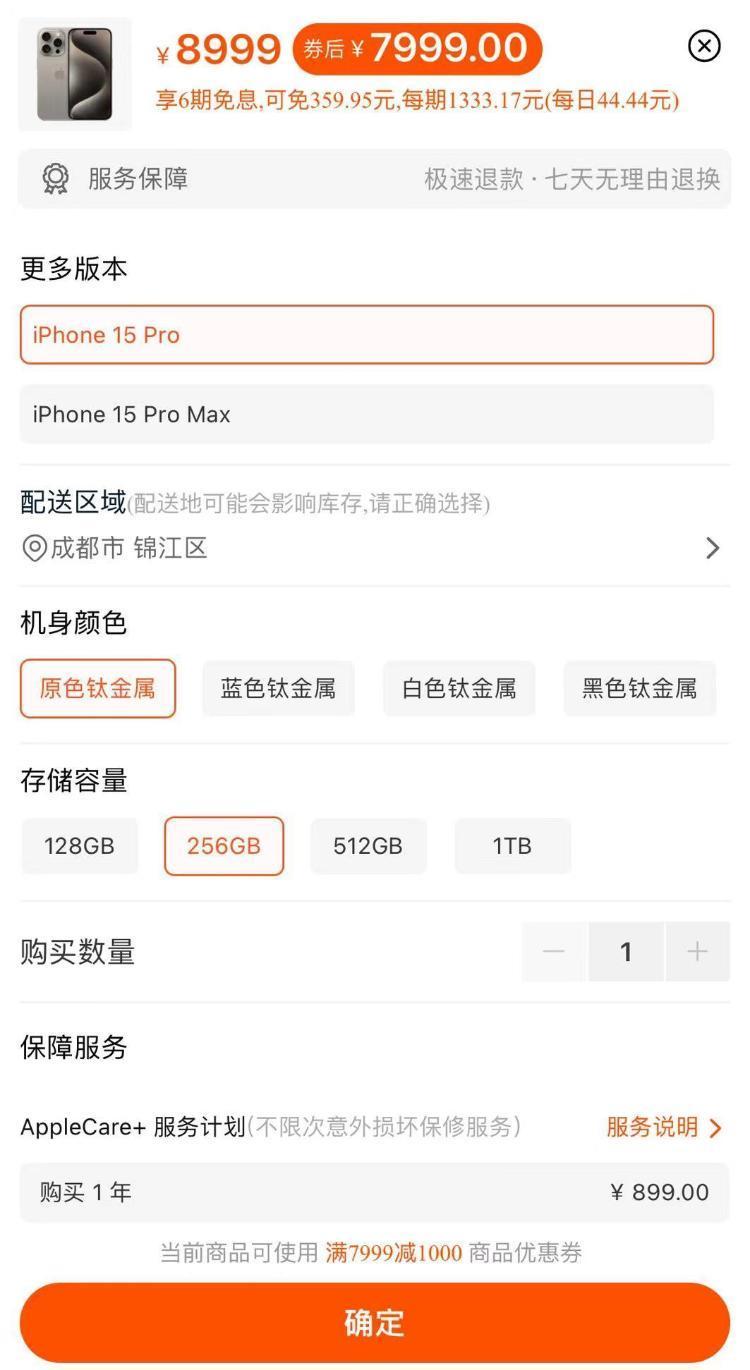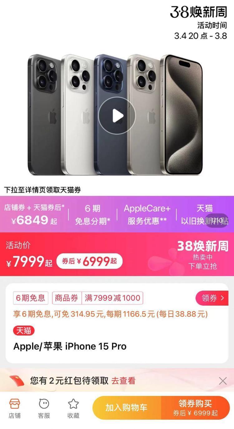 经查询发现,叠加店铺券和平台券后,同款iPhone 15 Pro 256G在淘宝苹果官方旗舰店的售价仅7999元,远低于官方售价8999元。