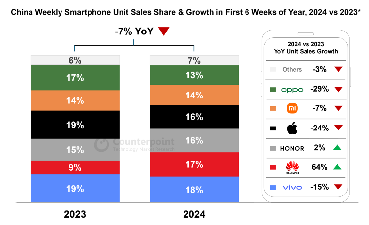 与之相对的是,华为前六周销量暴涨64%,市占率从9.4%上升到了16.5%,超越了苹果。