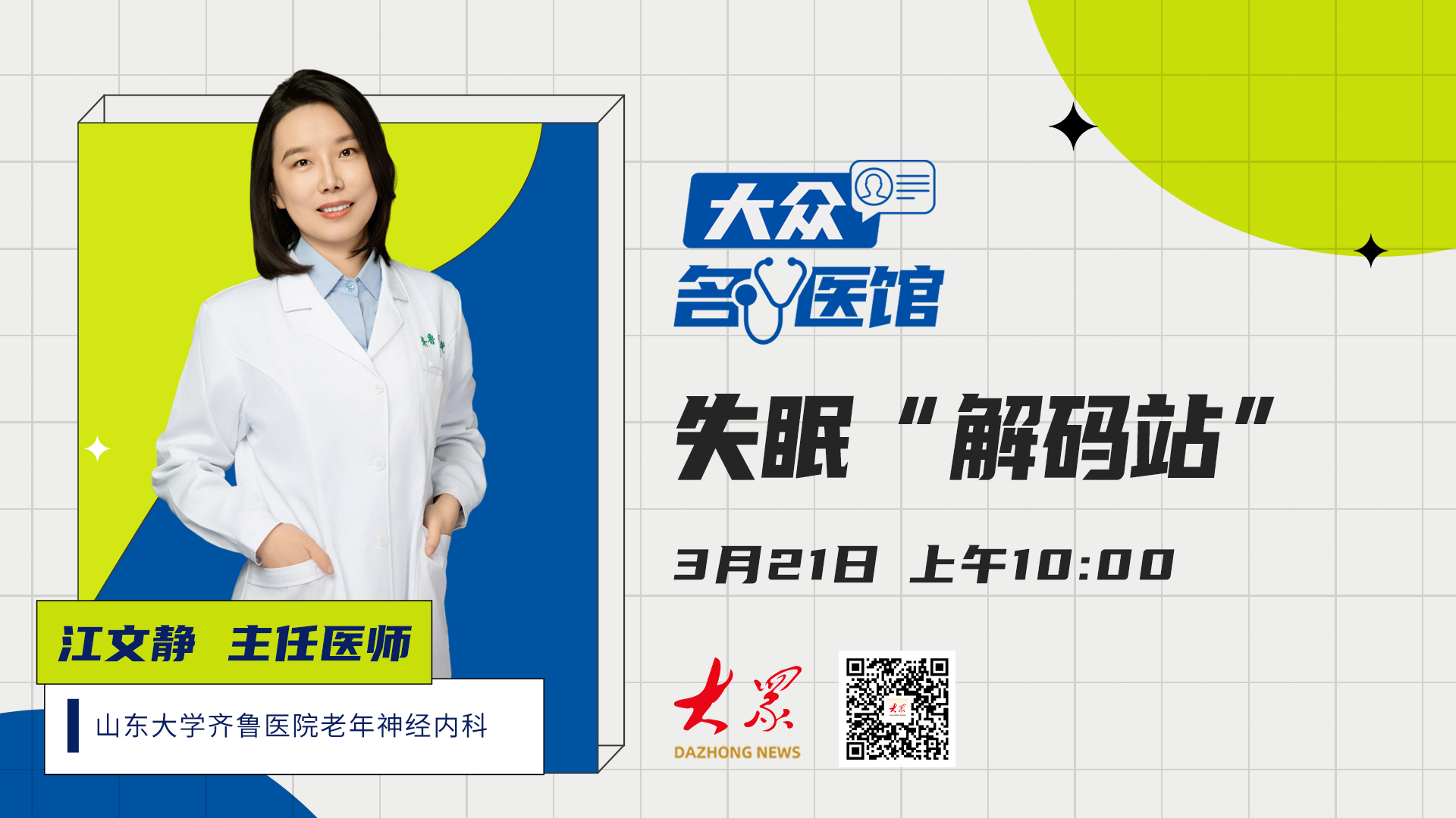 在3月21日世界睡眠日到来之际,2024年3月21日上午10点,《大众名医馆》邀请山东大学齐鲁医院老年神经内科主任江文静做客直播间,为失眠的朋友们答疑解惑。