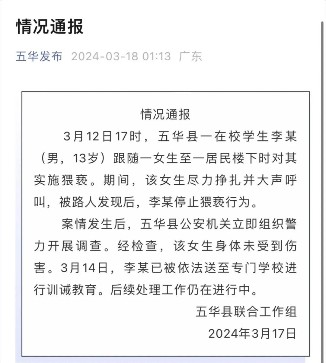 据广东省梅州市五华县联合工作组深夜通报,3月12日17时,五华县一在校学生李某(男,13岁)跟随一女生至一居民楼下时对其实施猥亵。其间,该女生尽力挣扎并大声呼叫,被路人发现后,李某停止猥亵行为。