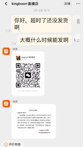 3月17日,红星资本局以消费者身份联系“kingboom”直播店,询问不发货的原因时,对方称可以联系“专属客服”微信。3月18日,该专属客服回复红星资本局称,会按照平台规则给客户赔偿,商家也会补贴100元的赔偿。如果客户需要发货的话可以耐心等待,会陆续发出。但红星资本局追问有没有明确发货时间时,对方表示,目前还没有详细通知。
