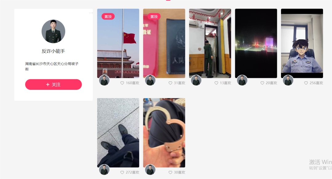 且其账号主页使用“湖南省长沙市天心区天心分局坡子街”为个人简介以及其他多条视频内含警官证、警服、手铐等敏感要素。