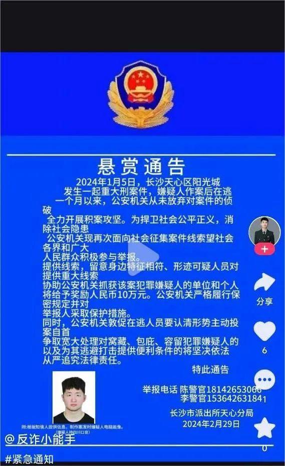 2月29日,网民“反诈小能手”发布视频,视频内容为带有警徽的《悬赏通告》,通告称近期长沙天心区发生重大刑事案件,拟向公众有偿征集线索,并附所谓嫌疑人图片及民警联系方式,落款为“长沙市派出所天心分局”。